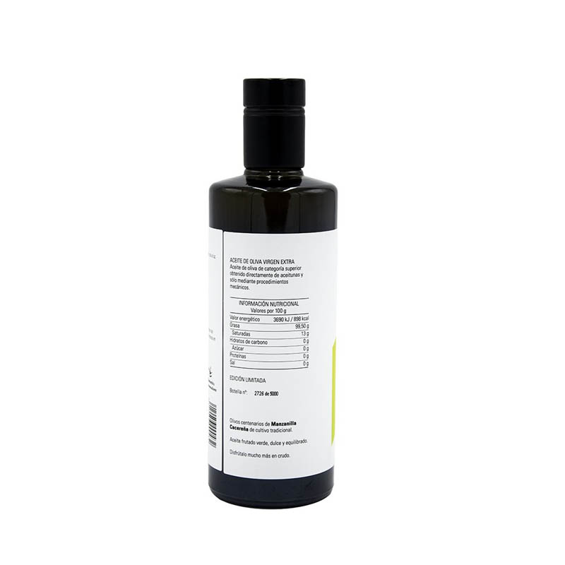 Aceite de Oliva Virgen Extra Monovarietal de categoría superior elaborado a partir de la variedad manzanilla cacereña absolutamente verde. De Olivares cultivados en espacios “Red Natura 2000” de especial protección ambiental. Cultivo tradicional y de secano.