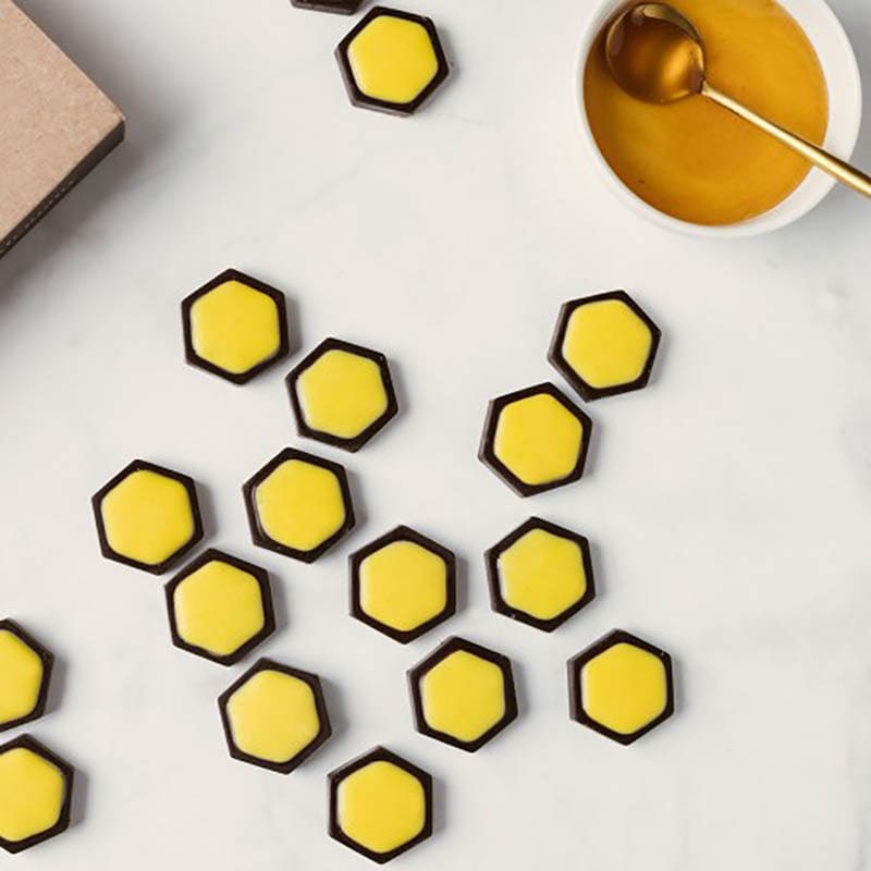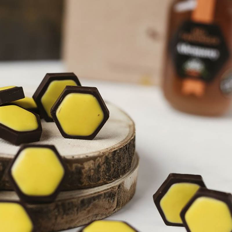 Hexágonos de chocolate negro rellenos con miel que contiene un 85% de cacao procedente de la República Dominicana con relleno de miel Alemany, una de las más reconocidas de España.