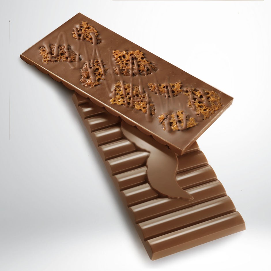 Ingredientes: cobertura de chocolate leche (88%) (azúcar, pasta de cacao, manteca de cacao, LECHE entera en polvo, LECHE desnatada en polvo, emulgente: lecitina de SOJA, aroma natural de vainilla), teja de ALMENDRA 12% (ALMENDRA, MANTEQUILLA (LECHE), azúcar moreno de caña integral, LECHE, harina de arroz).