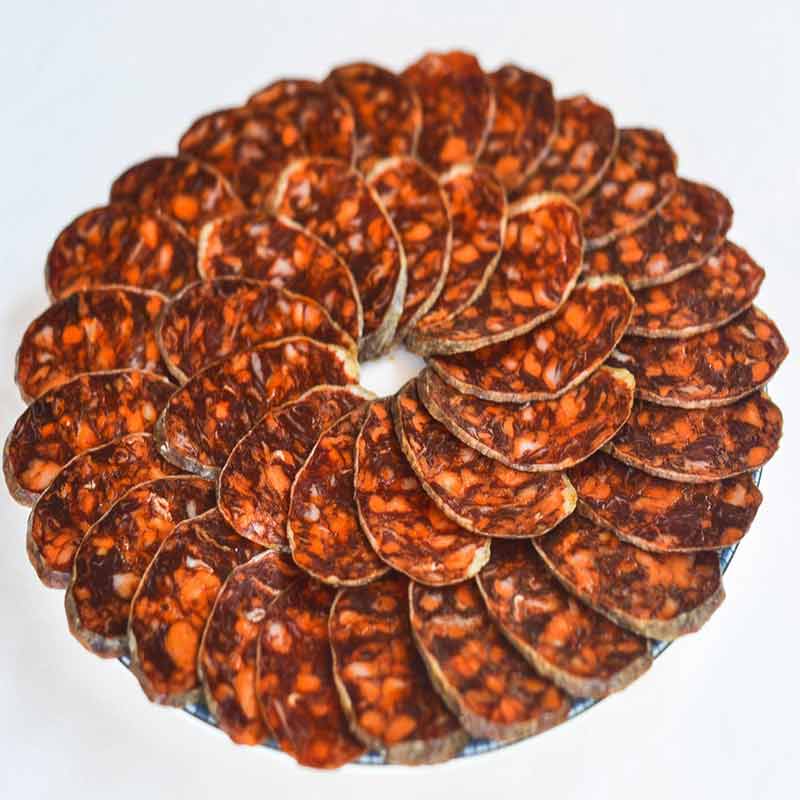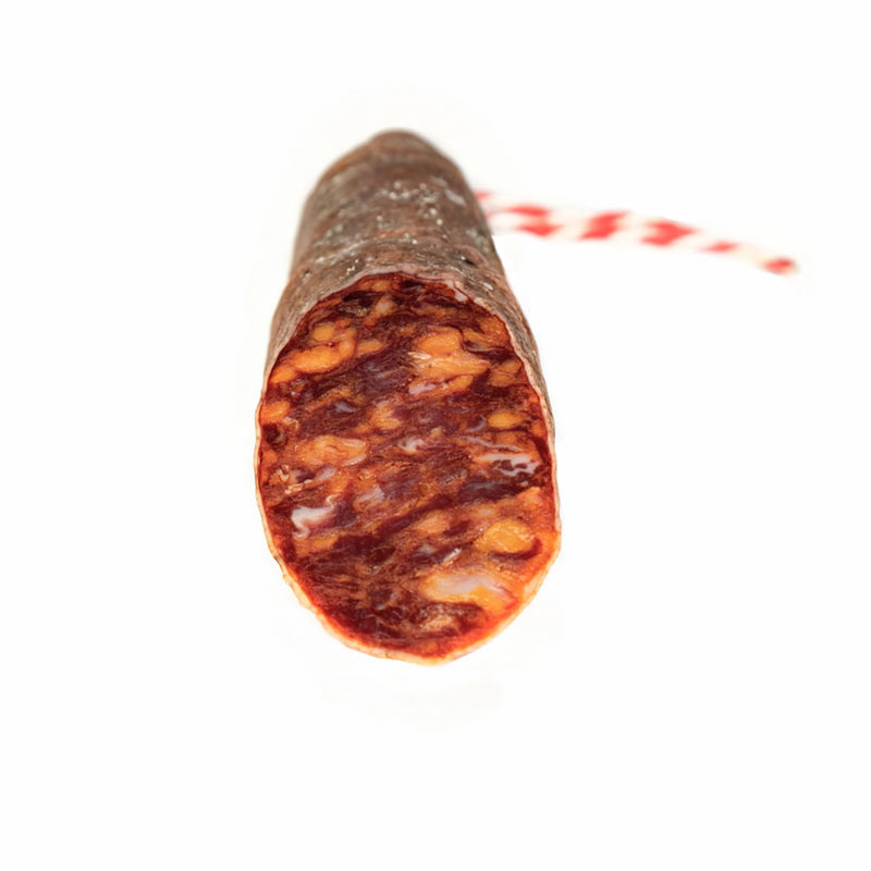 El chorizo es el embutido español más popular y más internacional. Se prepara a partir de carne de cerdo, grasa de cerdo, y especias como el pimentón y en algunos casos, com es este caso, el ajo. El chorizo de cerdo tiene ese color rojo tan característico que le aporta el pimentón.