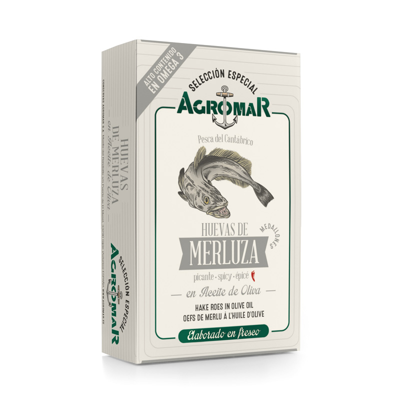 Huevas de Merluza en aceite de oliva picantes Agromar, una conserva Gourmet muy sabrosa y delicada.