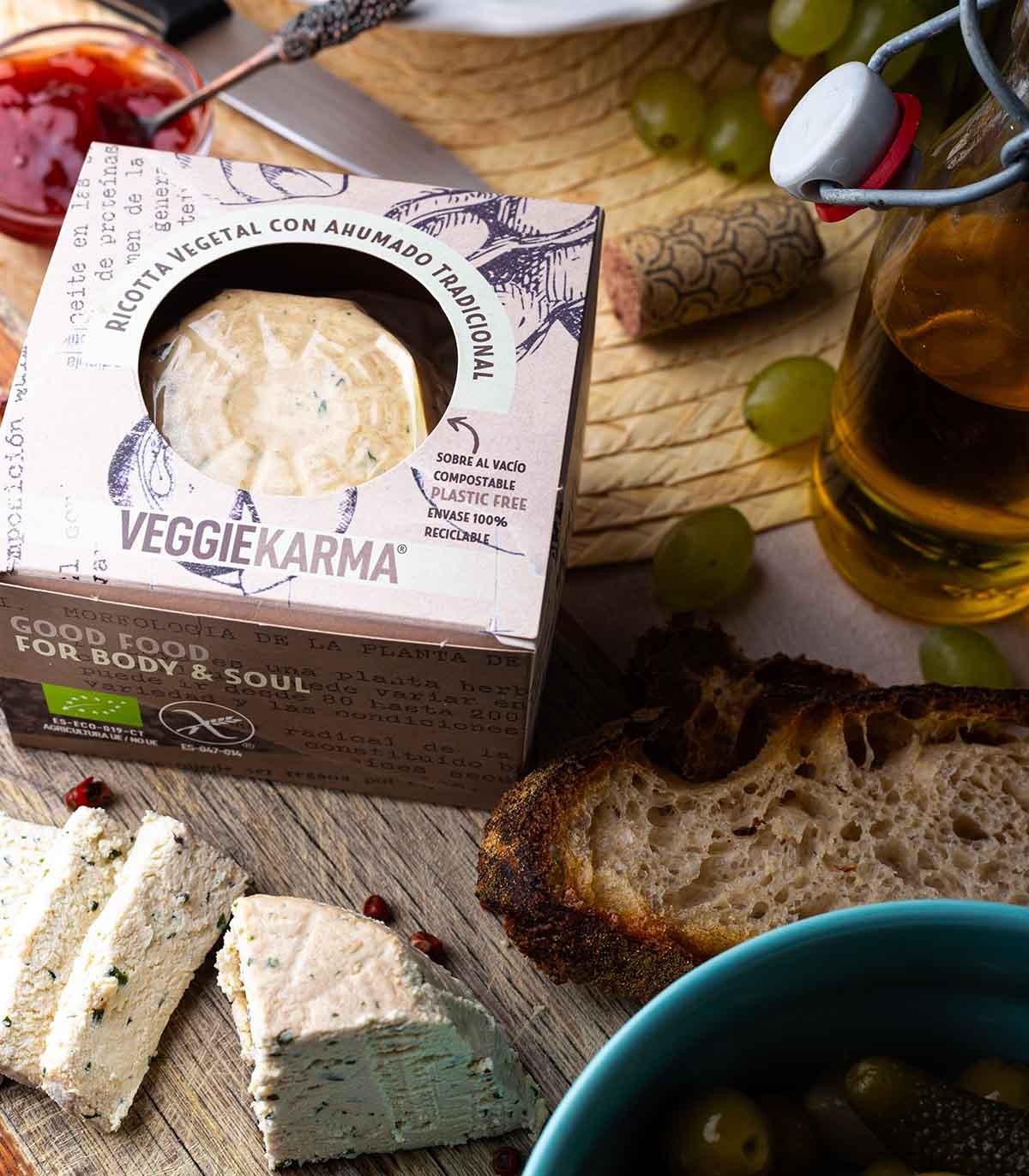 El Cremoso Vegano Ahumado de Karmage Veggie Karma es un producto innovador, 100% vegetal y ecológico, elaborado a base de bebida de soja orgánica fermentada. Pensado para quienes no consumen queso por convicción o necesidad, pero desean disfrutar de una textura suave y cremosa, similar a la Ricotta italiana, el Requesón español o la Faisselle francesa.