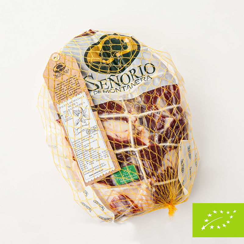 La paleta ecológica de bellota 100% ibérica Señorío de Montanera está elaborada con cerdos 100% ibéricos criados en dehesas certificadas como explotaciones ecológicas, con una alimentación 100% natural desde su nacimiento hasta el periodo de montanera, cuando se alimentan exclusivamente de bellotas y pastos naturales. Su elaboración sin aditivos ni conservantes artificiales, requiere de un cuidado mucho más exhaustivo y artesanal que los ibéricos tradicionales. Su maduración natural en secaderos y bodegas excavadas en roca afinan sus características organolépticas, consiguiendo unos matices de aroma y sabor propios del producto gourmet más exquisito.