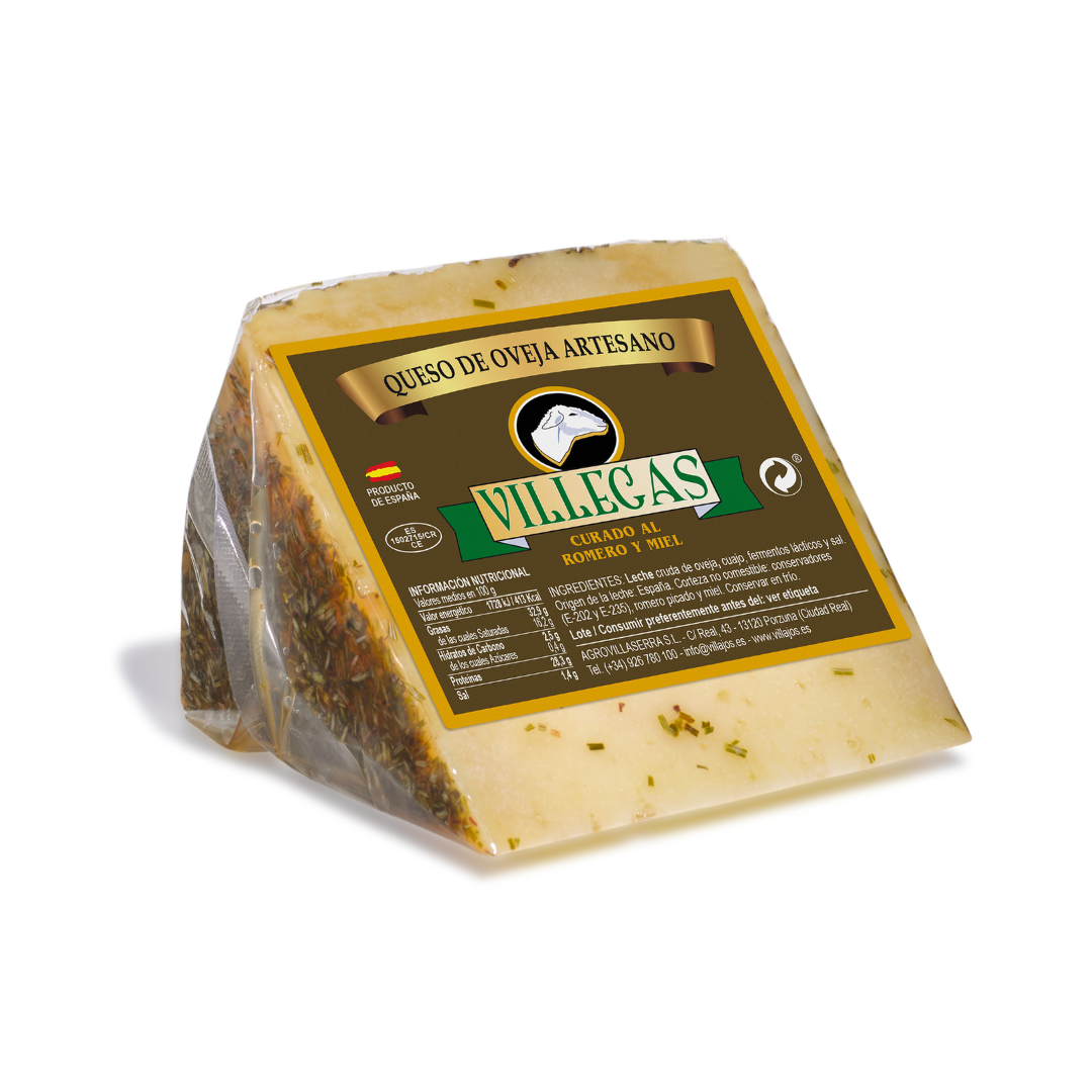 Descubre la esencia de La Mancha en cada bocado con este queso artesano de oveja curado cubierto de miel y hojas de romero, elaborado por la familia Los Villajos siguiendo métodos tradicionales y con leche cruda de oveja.