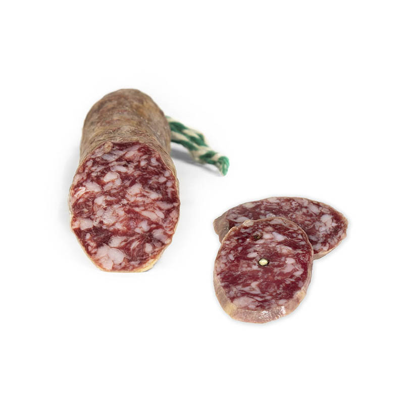 El salchichón ibérico Señorío de Montanera está elaborado con magros de recorte de jamón y paleta, y otros magros extras cuidadosamente escogidos de cerdos de bellota 100% ibéricos. Destaca en su aliño la pimienta negra molida y en grano, y la nuez moscada rallada. Las proporciones de los distintos ingredientes se eligieron entre las mejores chacinas tradicionales realizadas artesanalmente en las matanzas de la zona, y guardadas como uno de los principales tesoros de Señorío de Montanera.