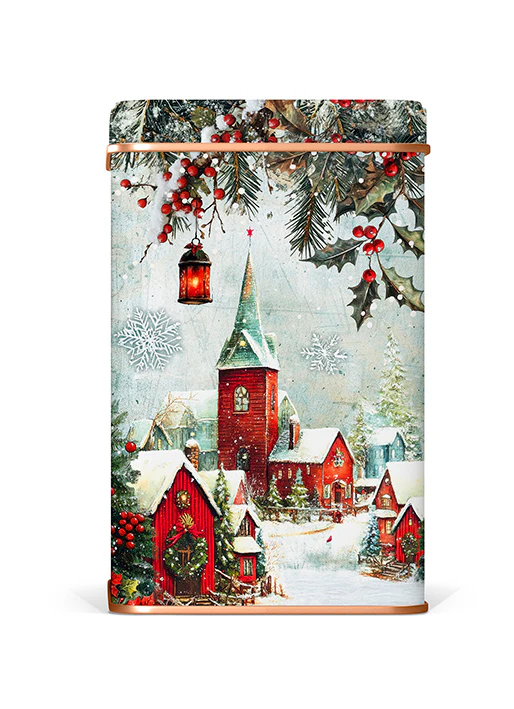 Disfruta de 300 g de las galletas seleccionadas por Lady Joseph: chocolate relleno, cookie de cacao y galleta de caramelo, presentadas en una lata metálica navideña.