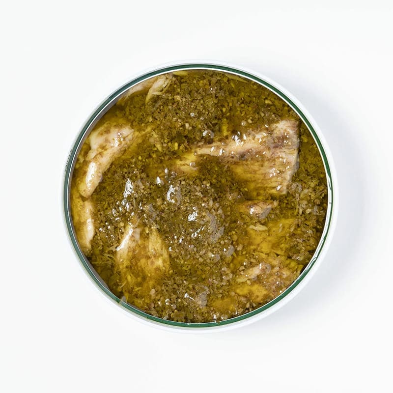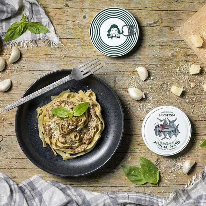 Tras el éxito del lanzamiento del atún al curry, nuestro atún sigue de viaje, en esta ocasión viaja de la India a Italia. El resultado son unas deliciosas ventrescas de atún claro bañadas en un intenso pesto a base de albahaca fresca, queso parmesano y nueces. Una receta enlatada, ideal para pastas y ensaladas.